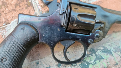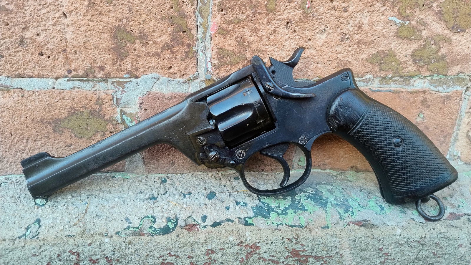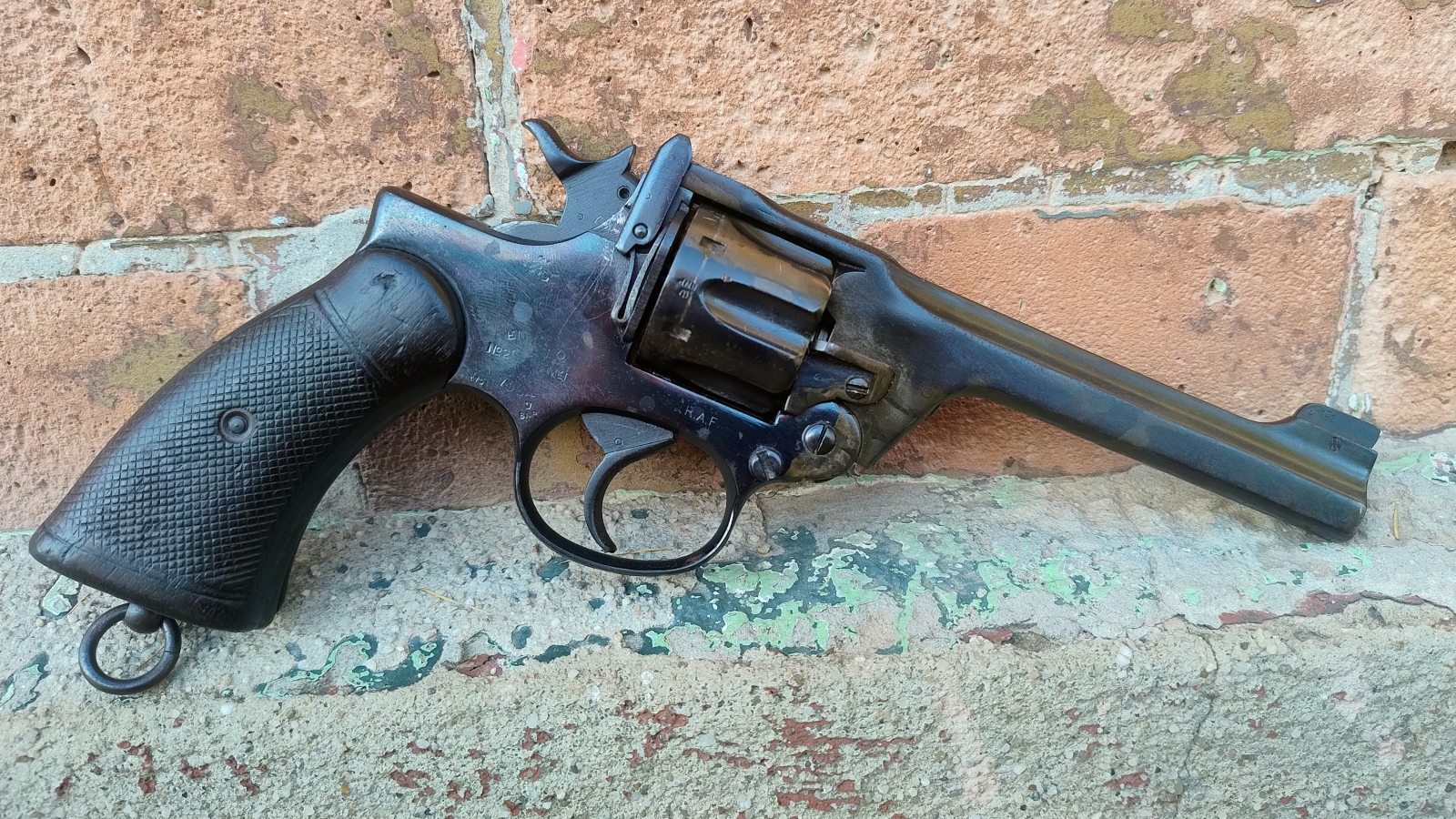 Drugi oprócz Webleya podstawowy rewolwer armii brytyjskiej. Kiedy rząd brytyjski zdecydował o konieczności zastąpienia rewolwerów Webley mark IV w kalibrze .455 nową konstrukcją propozycje jego skonstruowania złożono firmie Webley, ta jednak nie chciała zgodzić się na odstąpienie od patentu. Zakład RSAF (Royal Small Arms Factory) z Enfield brzydko mówiąc zerżnął pracę domową Webleya i zaprojektował broń bardzo zbliżoną do Webleya Mark IV. Produkowano je od 1932 do 1951 roku. Prezentowana sztuka została wyprodukowana z przeznaczeniem dla RAFu (oznaczenie R.A.F na szkielecie). Broń przeoksydowana i polerowana, ale za to w pełni zgodna numerycznie. Lufa bardzo ładna, gwint wyraźny, ostry i błyszczący.