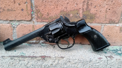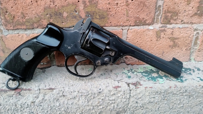 Drugi oprócz Webleya podstawowy rewolwer armii brytyjskiej. Kiedy rząd brytyjski zdecydował o konieczności zastąpienia rewolwerów Webley mark IV w kalibrze .455 nową konstrukcją propozycje jego skonstruowania złożono firmie Webley, ta jednak nie chciała zgodzić się na odstąpienie od patentu. Zakład RSAF (Royal Small Arms Factory) z Enfield brzydko mówiąc zerżnął pracę domową Webleya i zaprojektował broń bardzo zbliżoną do Webleya Mark IV. Produkowano je od 1932 do 1951 roku. Prezentowana sztuka to wersja bez możliwości odciągania kurka palcem i prawdopodobnie została wyprodukowana w roku 1944 natomiast później przeszła remont w latach 50-tych. Stan techniczny bdb, stan lufy bdb.