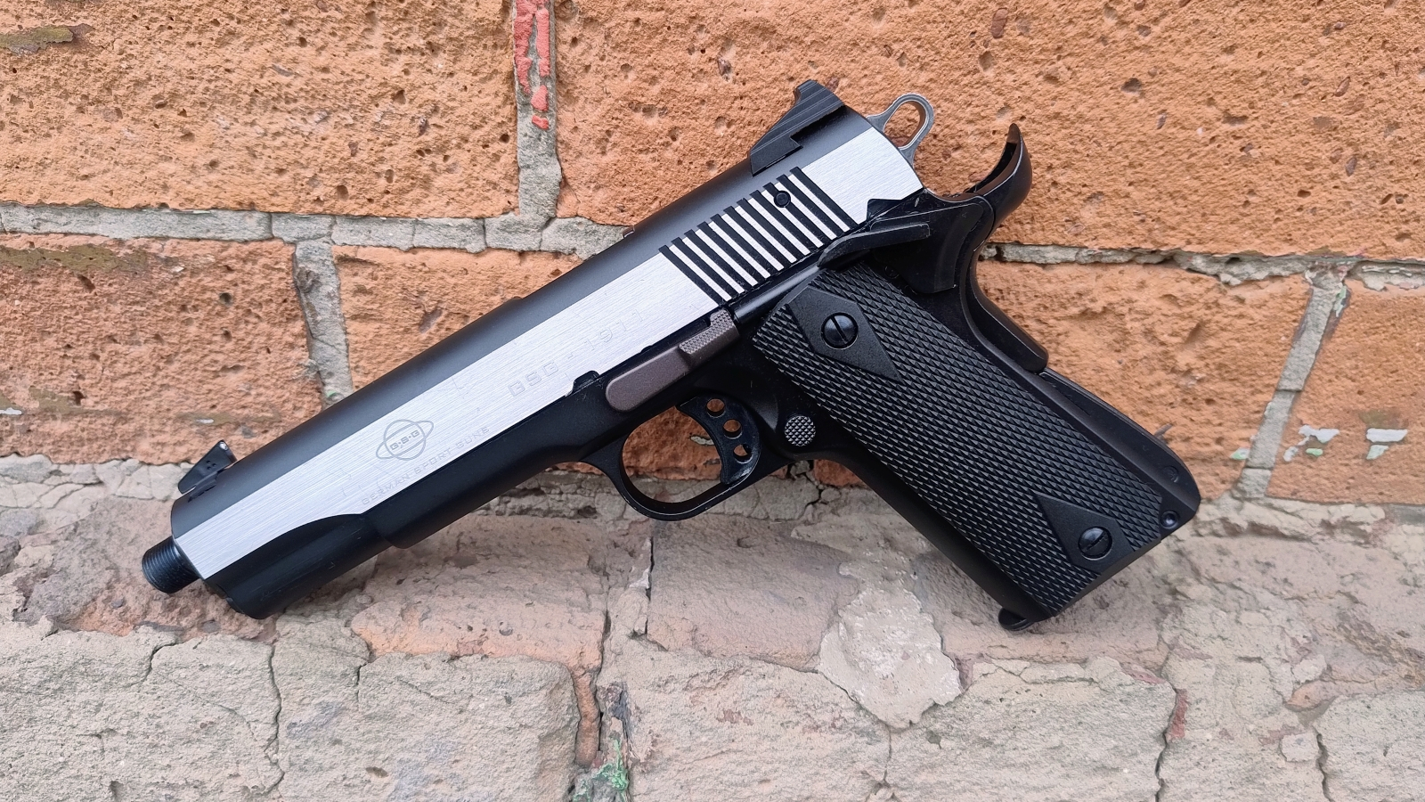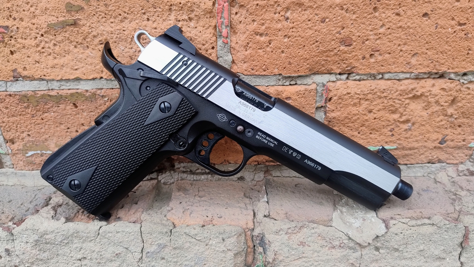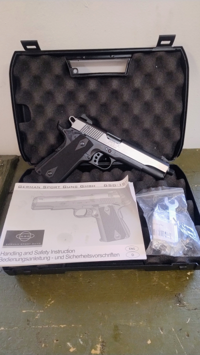 Samopowtarzalny pistolet sportowy bocznego zapłonu niemieckiej firmy German Sports Guns. Model 1911 Stainless. Broń używana w stanie bdb. Broń wyposażona w gwint na końcu lufy na który można zamontować urządzenie wylotowe.