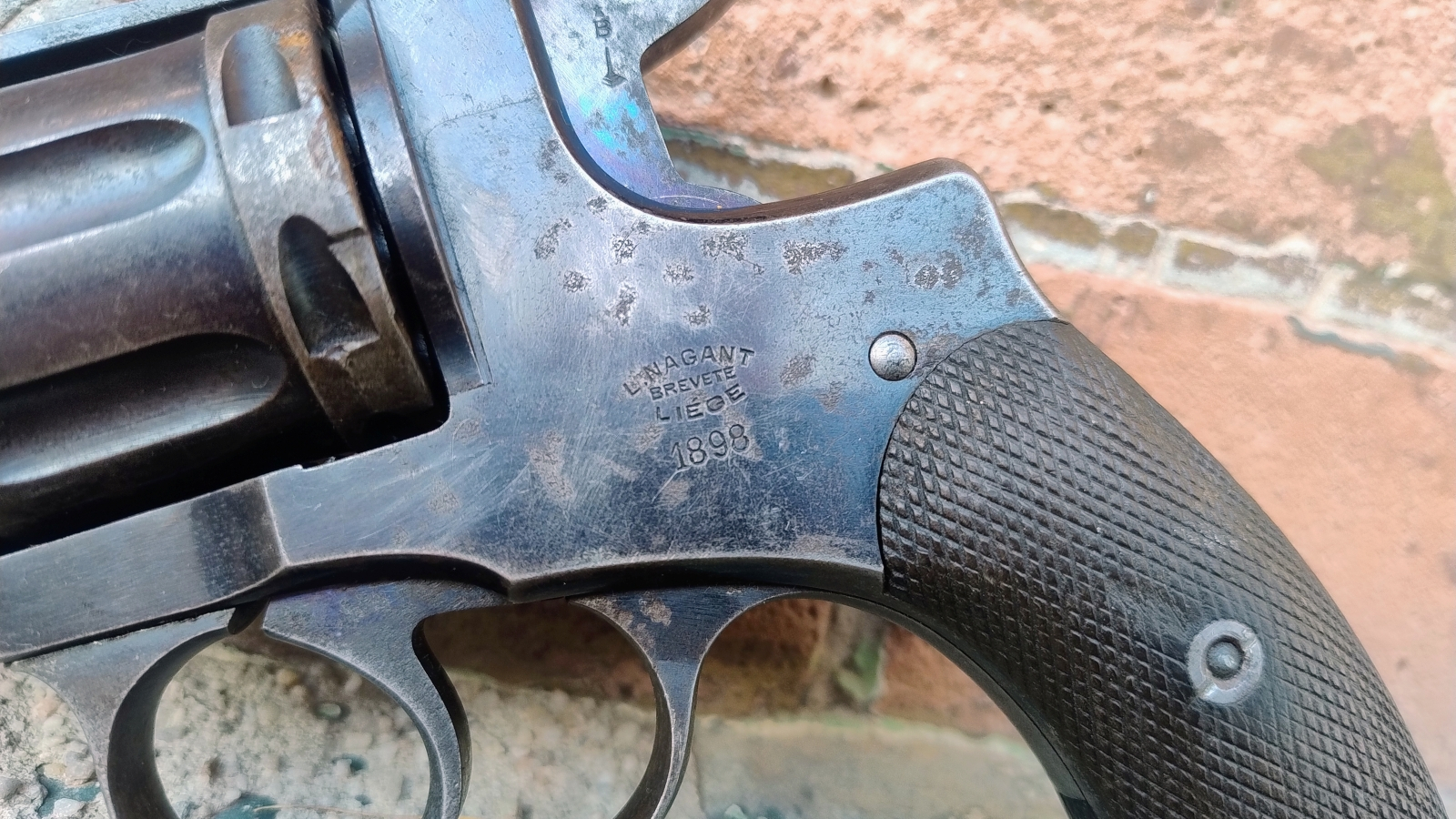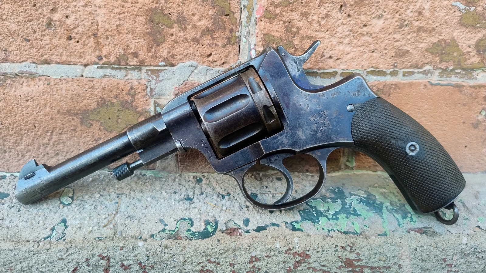 Carskie i sowieckie naganty to znamy wszyscy, ale tutaj przed Państwem oryginał Belgijski modelu M1895! Rok produkcji 1898. Oprócz sygnatur niczym nie różni się od poźniejszej produkcji carskiej i sowieckiej. Broń w oryginalnym stanie, w pełni zgodna numerycznie. Pwołoka oryginalna. Na szkielecie, lufie i bębnie jednolite odbiory belgijskie. Piękne uzupełnienie kolekcji broni krótkiej! Przewód lufy w stanie dostatecznym, gwint jest ale matowy i pokryty kaszą i wżerkami. Patrząc na jego rocznik to i tak można powiedzieć, iż broń zachowała się w bardzo dobrym, strychowym stanie. Polecamy!