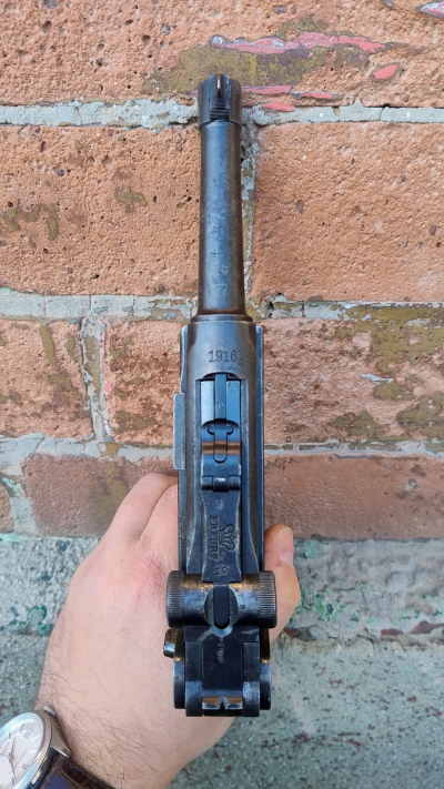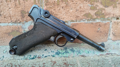 Jeden z najbardziej rozpoznawalnych i pożądanych pistoletów w świecie kolekcjonerów! Pistolet P08 Parabellum konstrukcji Georga Lugera był podstawową bronią krótką w armii niemieckiej przez kilkadziesiąt lat. Konstrukcja używana podczas I i II wojny światowej. Szczególnie ceniony i poszukiwany jako trofeum przez żołnierzy alianckich walczących na zachodnim froncie II wojny światowej. Prezentowany egzemplarz to produkcja fabryki Erfurtu ze środka I wojny światowej. Broń posiada wszystkie odbiory wojskowe. Broń w pełni zgodna numerycznie (oprócz zamka który został wymieniony prawdopodobnie w epoce - ma stempel Waa). Magazynek ze stopką drewnianą czyli właściwy dla I wojny światowej. Pistolet używany, strzelany. Oksyda oryginalna. Stan wizualny taki jak widać na fotkach, widać, że bron sporo przeszła i ma duszę. Lufa w stanie dostatecznym - gwint wyraźny, ale matowy z kaszą i wżerkami. Okładziny oryginalne. Technicznie wszystko ok. Piękna ozdoba każdej kolekcji!