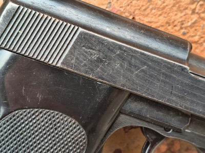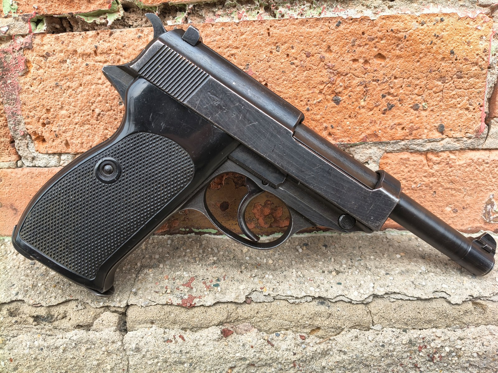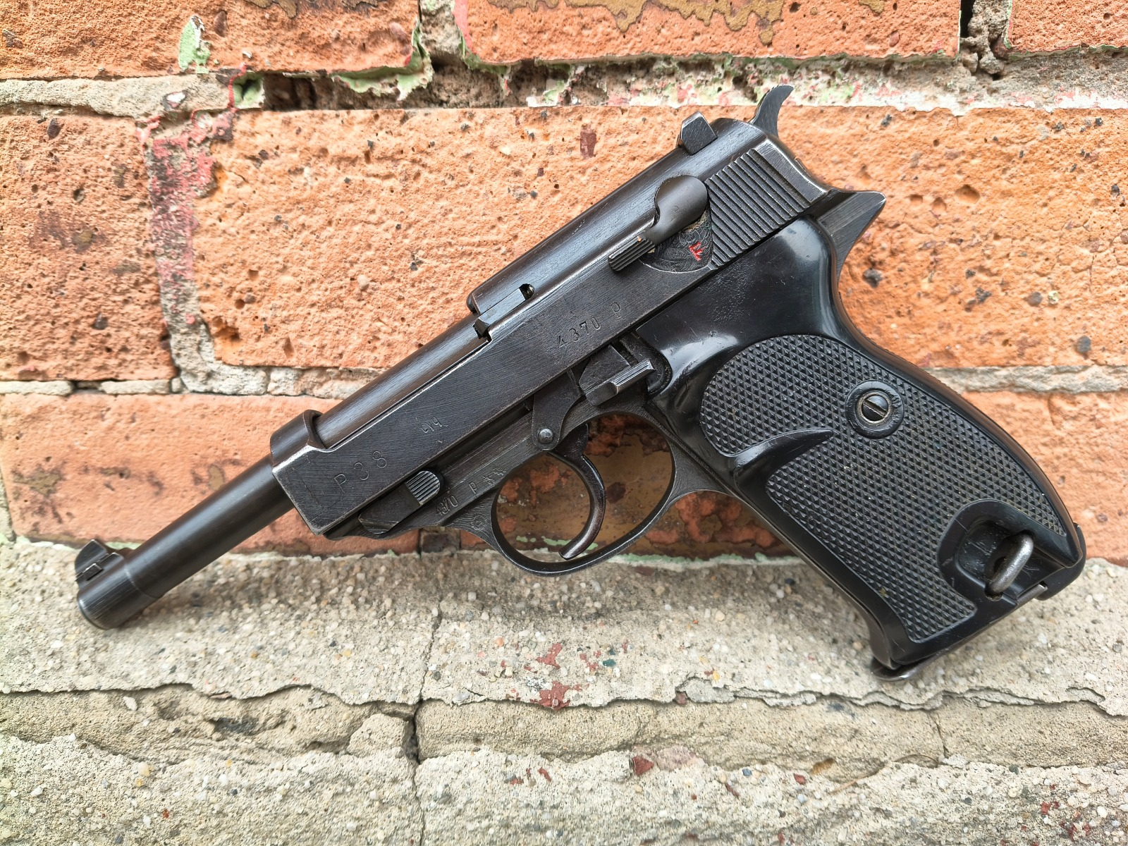 Następca słynnego pistoletu P08 Parabellum czyli nie mniej słynny Walther P38. Egzemplarz oryginalny produkcji zakładów Spreewerk z roku 1944. Broń zgodna numerycznie. Lufa i okładziny wymienione podczas służby w powojennej niemieckiej policji (obecne także charakterystyczne punce w kształce słoneczka). Powłoka wygląda na oryginalną, wojenną. Broń w stanie bdb, magazynek wojenny jvd. Przewód lufy w stanie bdb, błysk!