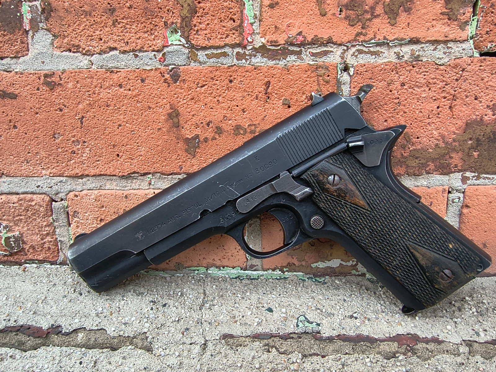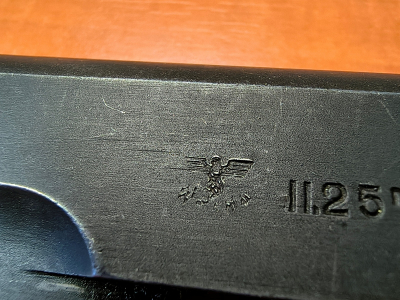 Norwegia już w 1914 roku przyjęła jako podstawowy pistolet swojej armii amerykańskiego Colta 1911 po drobnych modyfikacjach. Licencyjną norweską produkcję oznaczono jako m/1914, a potocznie określa się ją jako Coltem Kongsberg, od nazwy farbyki czyli Konbsberg Vapenfabrikk. Broń ta była produkowana przez Norwegię, aż do zajęcia tego kraju przez wojska Wehrmachtu. Niemcy przejęli zarówno egzemplarze z armii jak i zlecili kontynuację produkcji dla własnych sił zbrojnych. Zródła mowią o ok 8,2 tys sztuk wyprodukowanych pdoczas okupacji Norwegii z czego 3/4 tej liczby przypada na okres lat 1940-1942. W latach 1943-1944 fabryka przerwała produkcję na rzecz innych rodzajów broni. Produkcja m/1914 została wznowiona w 1945 roku i wtedy do momentu kapitulacji III Rzeszy wyprodukowano zaledwie 920 sztuk. Przed Wami właśnie jedna z tych 920 sztuk z roku 1945. Wg. żródeł tylko pistolety produkowane w 1945r był oznaczane niemieckim stemplem odbioru wojskowego Waa, a konkretnie numerem 84. Znany jest także zakres numeryczny tych sztuk, a obejmuje on numery od 29615-30534. Prezentowany egzemplarz ma numer 30090 zatem wszystko się zgadza. Broń w oryginalnym wykończeniu w 100% zgodna numerycznie oprócz dżwigni zwlaniania zamka (jest także norweska natomiast musiała zostać gdzieś wymieniona lub tak już zamontowana w fabryce - pamiętajmy, że to produkcja z ostatnich dni III Rzeszy więc logicznym jest, że pewne niezgodności nie miały wpływu na dopuszczenie broni do użytku). Lufa nienumerowana, posiada klasyczny malutki odbiór norweski. Wykonanie także wskazuje na zgodność produkcji z 1945r. Brak numeru na lufie nie jest niczym nadzwyczajnym w tak późnej produkcji. Przewód lufy bdb, błysk. Magazynek niestety amerykański produkcji Remingtona.