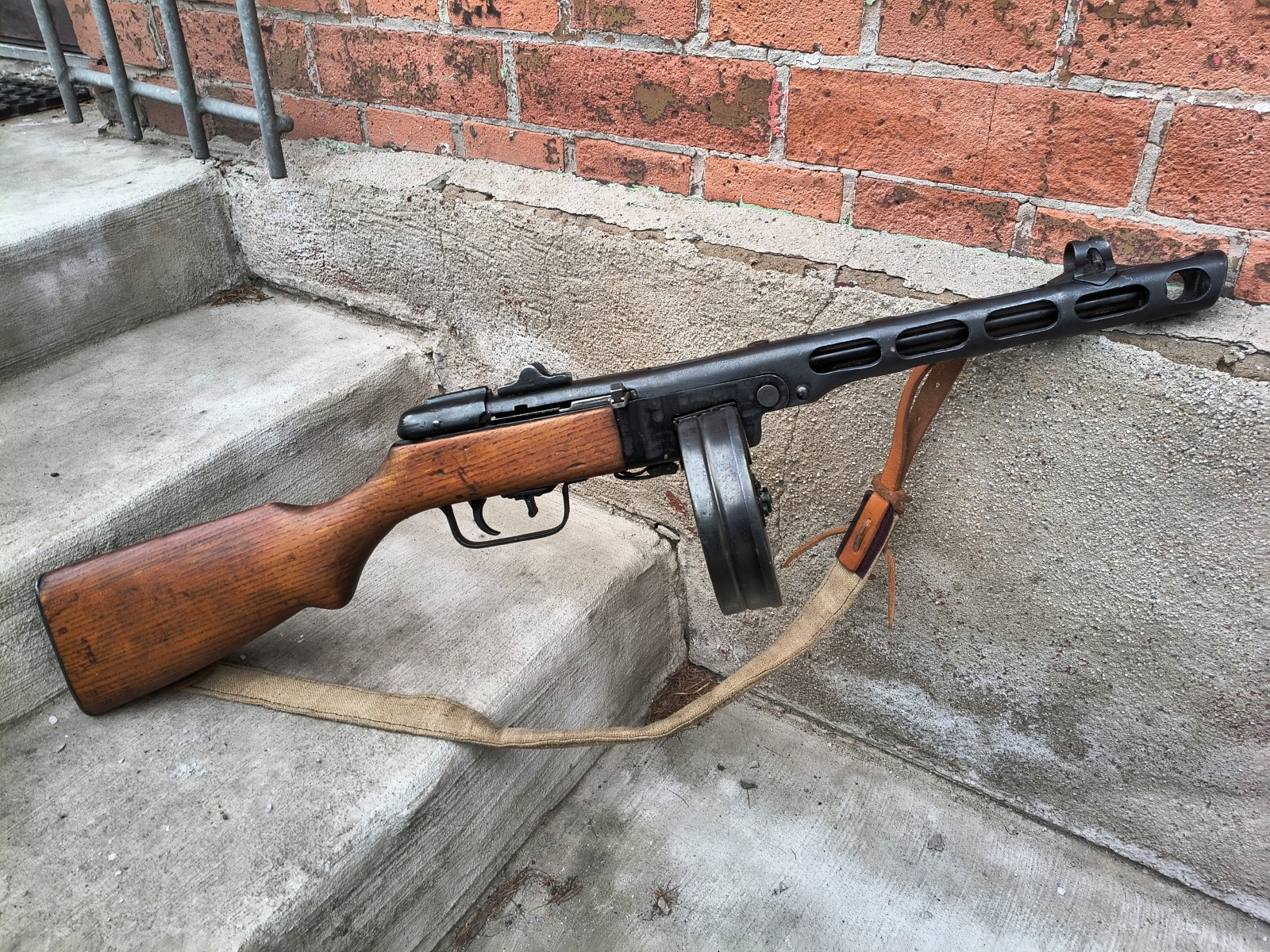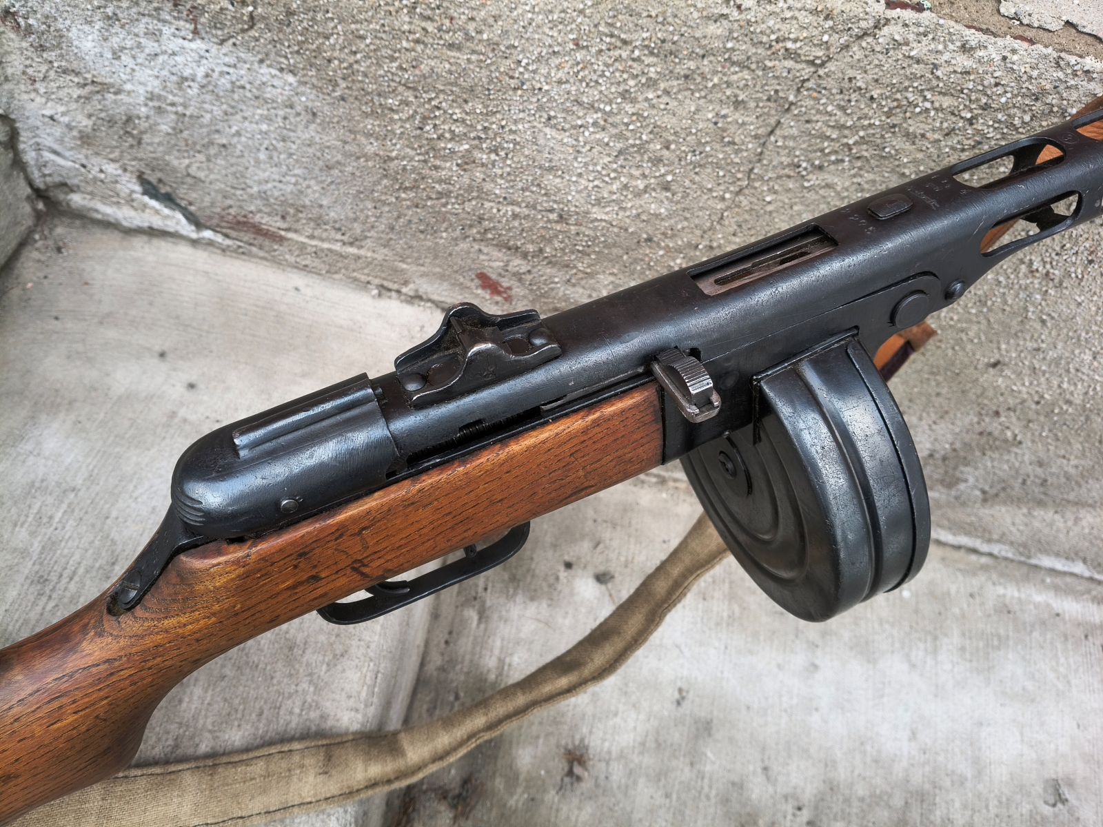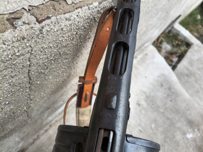 Klasyczna sowiecka pepeszka produkcji wojennej po remoncie powojennym z kopią wojennego pasa nośnego. Broń pozbawiona cech użytkowych na zasadach sprzed 2016r, wszystko ruchome i rozbieralne. Można oddać suchy strzał. SPRZEDAŻ KAŻDEJ OSOBIE PEŁNOLETNIEJ ZA OKAZANIEM DOWODU OSOBISTEGO, NIE JEST WYMAGANE POZWOLENIE NA BROŃ.