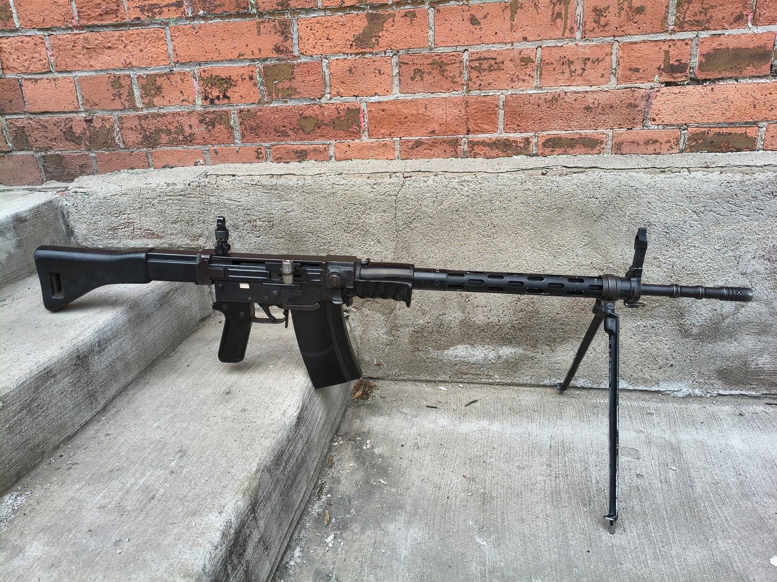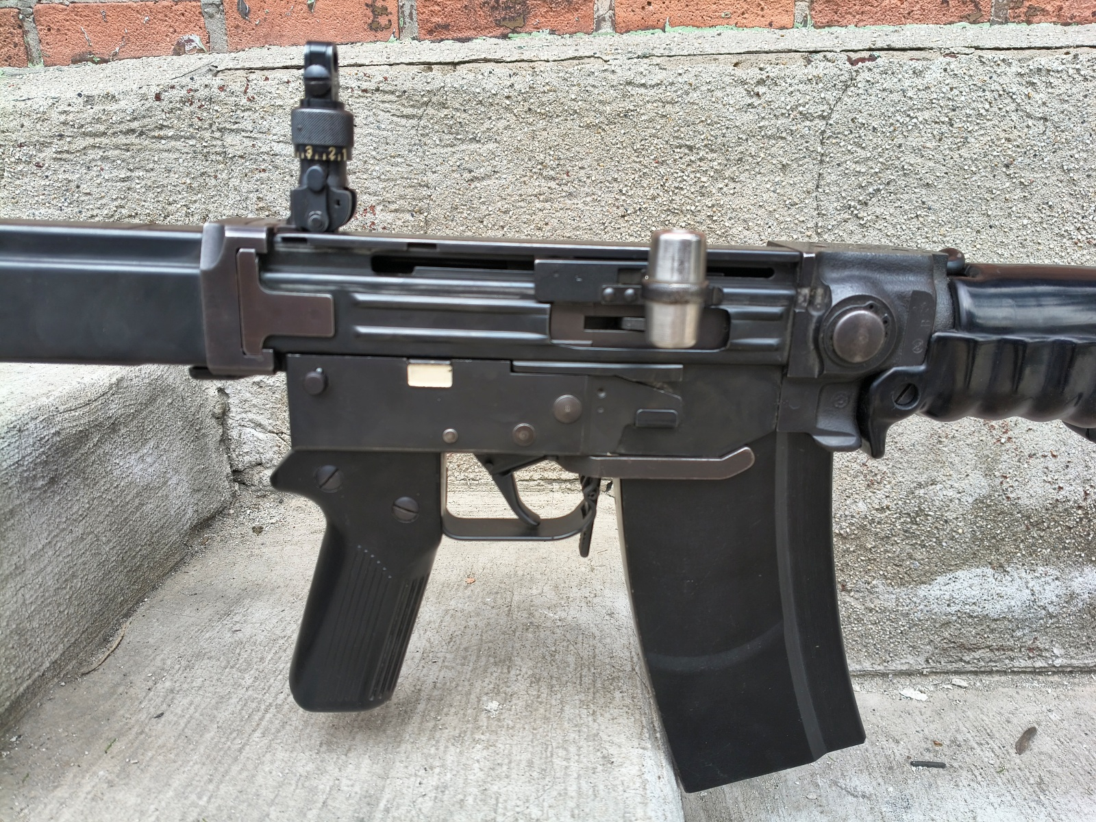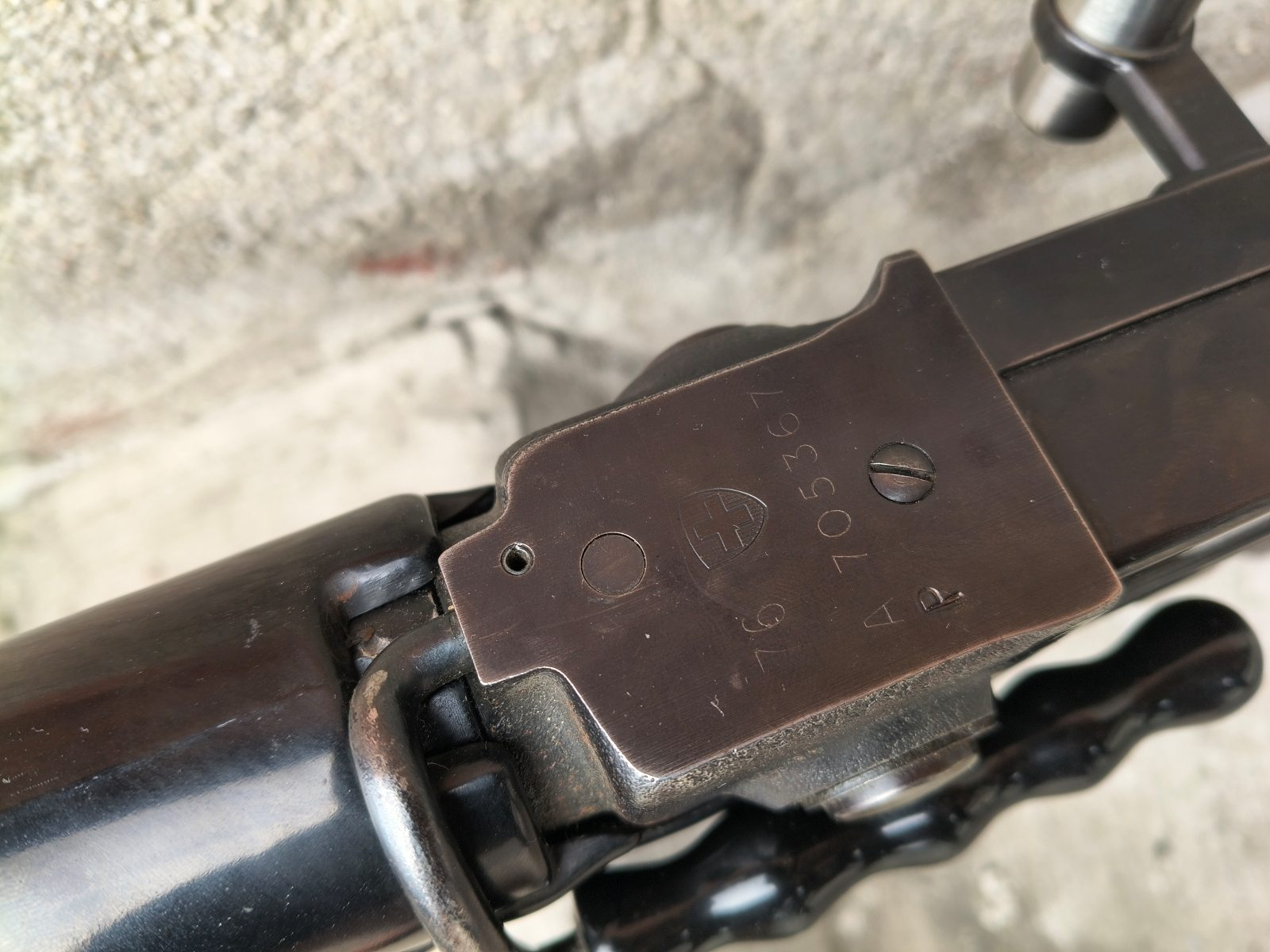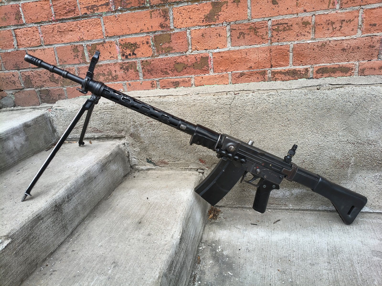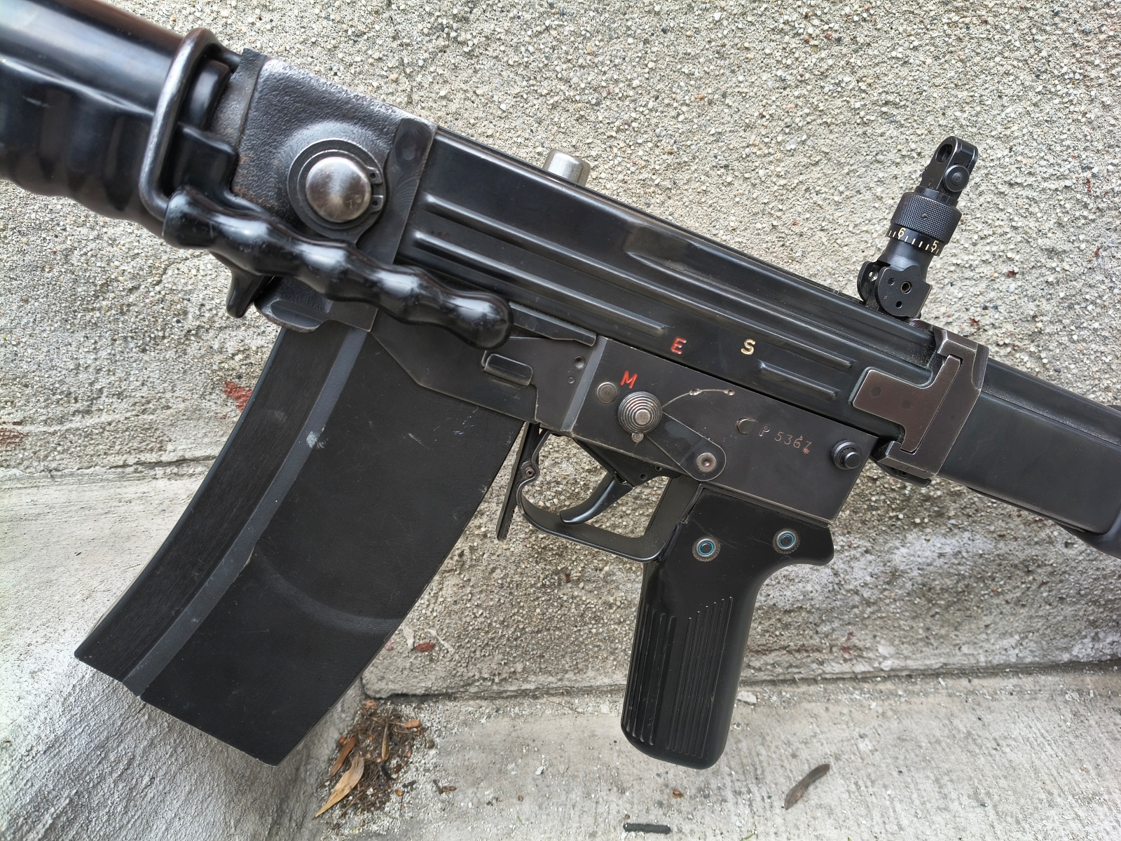 Szwajcarski karabin maszynowy firmy Schweizerische Industrie Gesselschaft wprowadzony na wyposażenie armii w 1957 roku i produkowany do roku 1985. Broń używana w stanie bdb, lufa bdb. Broń już w semi. Miejscami przetarcia powłoki od noszenia.