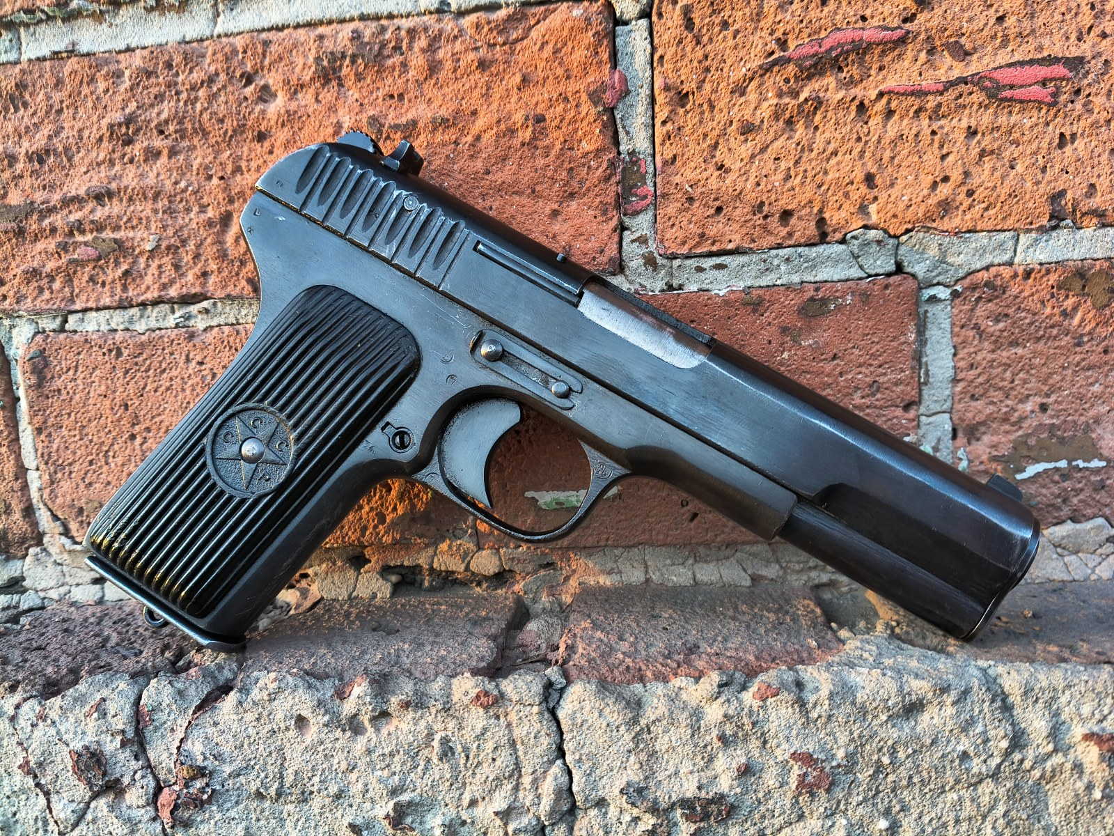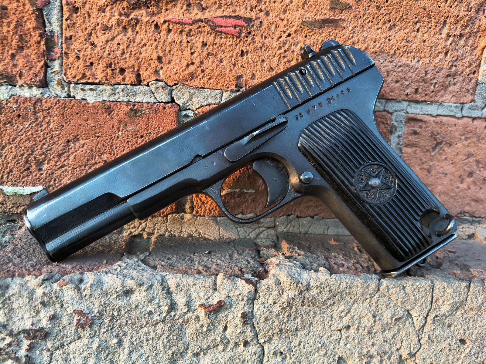Klasyka gatunku czyli oryginalny pistolet TT-33 zwany tetetką. Produkcja wojenna sowiecka z zakładów w Iżewsku. Rok produkcji 1945. Broń w pełni zgodna numerycznie fabrycznie oprócz magazynka. Broń w oryginalnej oksydzie (jest przełamanie odcienia na zamku z oku stron) w stanie bdb. Jedna okładzina oryginalna z 1945r z początków powrotu do bakelitu w na koniec II wojny, a druga wymieniona na wzór z już roku 1946 - broń pochodzi z agencji ochrony stąd pewnie podmianka. Kołek iglicy lekko naruszony - standard przy klikaniu na sucho, ale wszystko siedzi na swoim miejscu. Lufa w stanie bdb, gwint wyraźny i ostry, ale bez połysku znaczy używany.