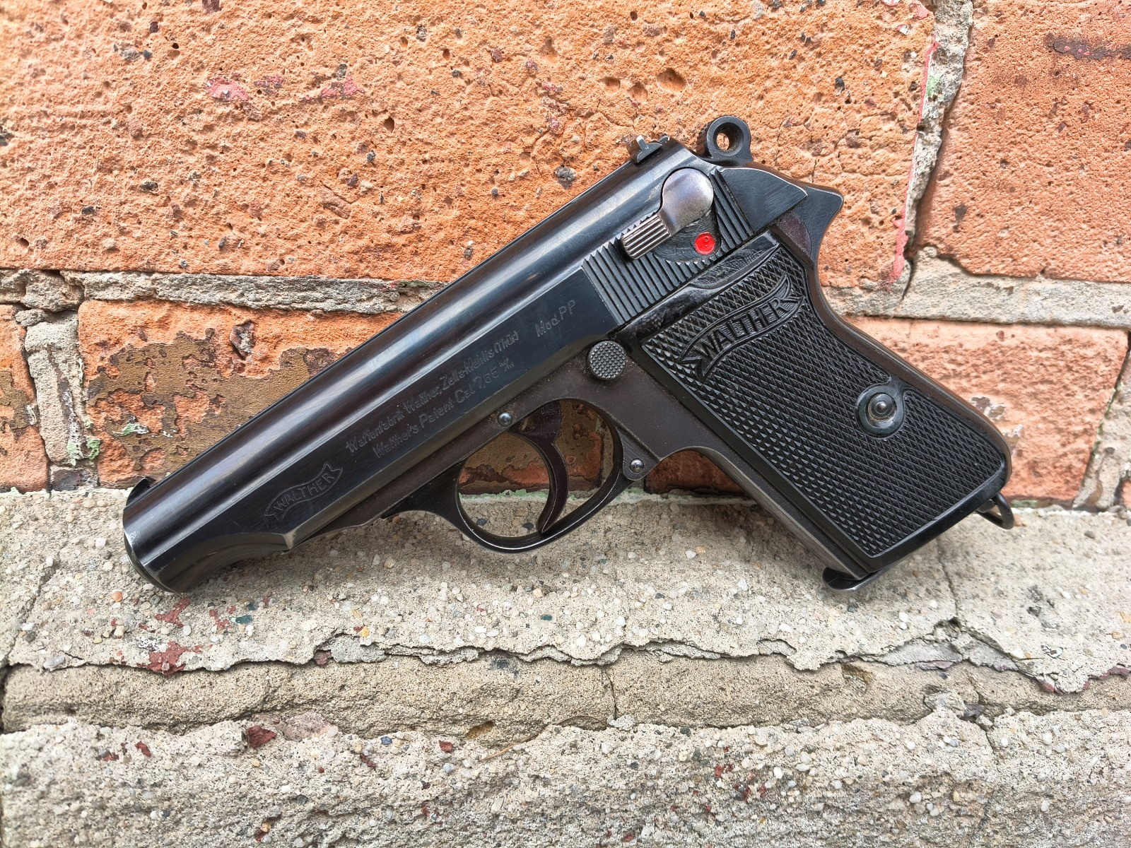 Walther PP zaczął podbijać niemiecki rynek już od 1929 roku. Rozwinięcie nazwy to Polizeipistole, w zamierzeniu przeznaczony dla funkcjonariuszy policji. Kultowy pistolet który na stałe zapisał się w historii broni palnej. Prezentowany egzemplarz pochodzi z roku 1940 wg. tabelki numerycznej i jest w stanie bdb. Lufa super - błysk. Oksyda oryginalna. Okładziny oryginalne, niepopękane. Magzynek oryginalny z epoki. Wersja PP z oczkiem do zamocowania smyczy. Po prostu podręcznikowy PP którego warto mieć w swojej kolekcji.