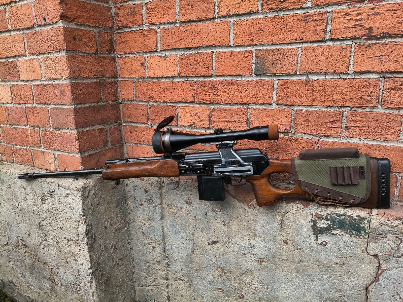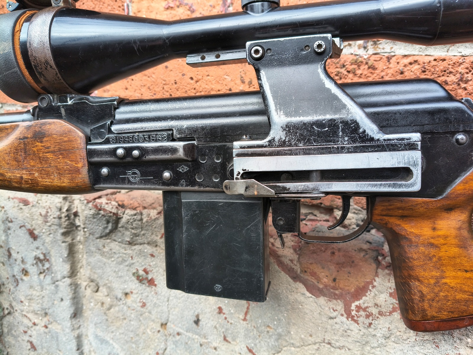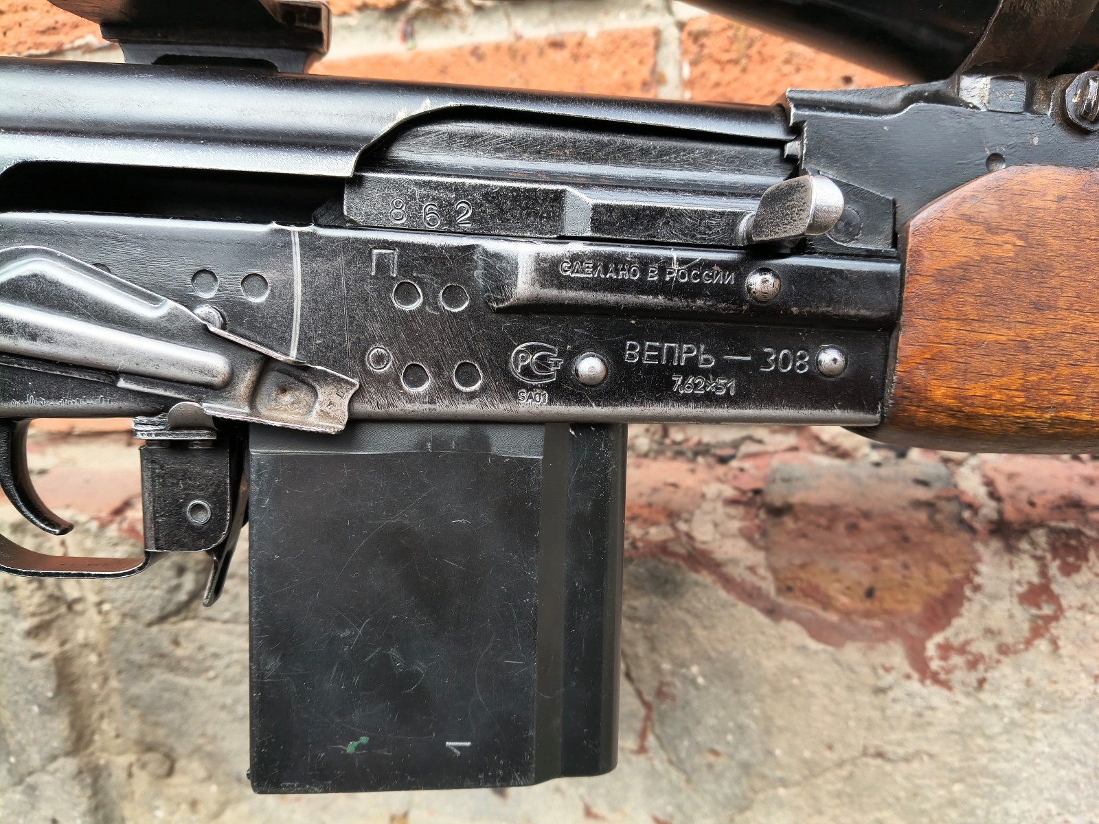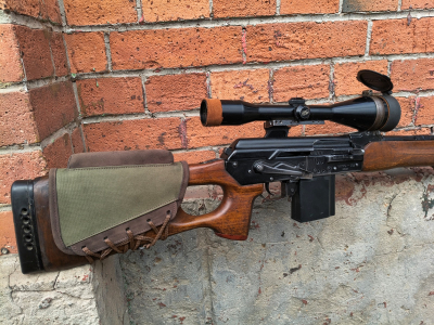 Półautomatyczny rosyjski karabin wyborowy z szyną boczną i lunetą, którego podstawą był swego czasu rkm RPK. Po upadku ZSRR w latach 90-tych sowiecki przemysł zbrojeniowy poszukiwał sposobów na sprzedaż i eksport powojskowej broni na rynki cywilne. W tym wypadku karabiny maszynowe RPK przerabiano w zakładach Mołot na cywile samopowtarzalne karabiny mysliwskie/sportowe VEPR 308. Broń była zasilana amunicją NATO czyli 7,62x51mm (.308 Win) i eksportowana na rynki zachodnie. Tutaj w komisie egzemplarz używany, technicznie w stanie dobry, lufa także db. W komplecie luneta niemeicka (optyka czysta) oraz 2 magazynki (do jednego da się załadować wyłącznie amunicję półpłaszczową ze względu na długość, drugi śmiga na każdej).